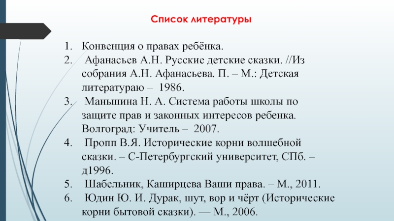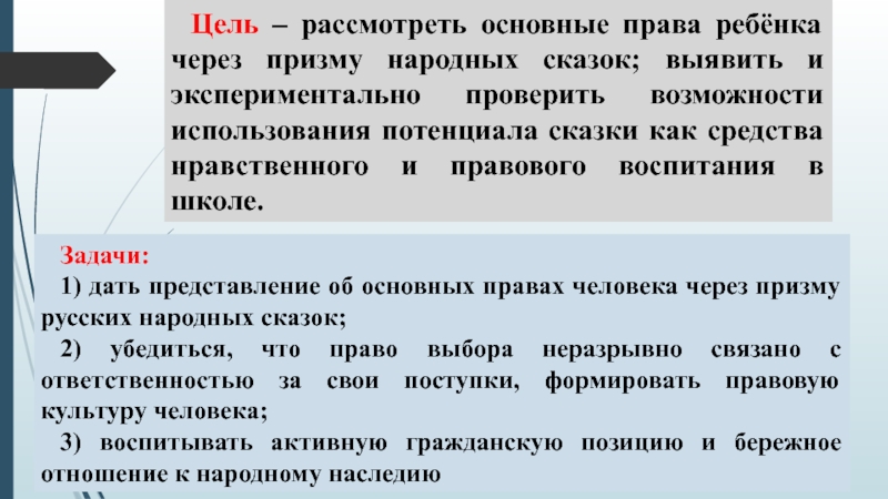 1) дать представление об основных правах человека через призму русских народных сказок;