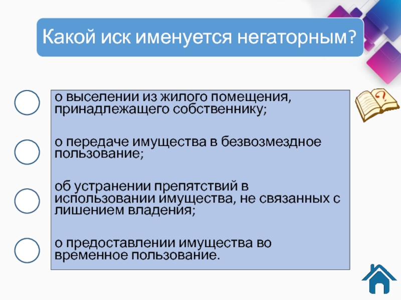 Слайд 11 Негаторный иск – это требования об устранении препятствий в осуществлении