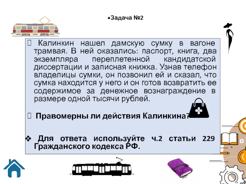 Слайд 28 Калинкин нашел дамскую сумку в вагоне трамвая. В ней оказались: