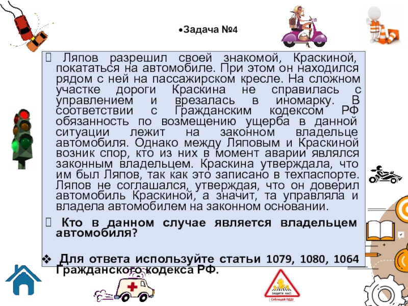 Слайд 30 Ляпов разрешил своей знакомой, Краскиной, покататься на автомобиле. При этом