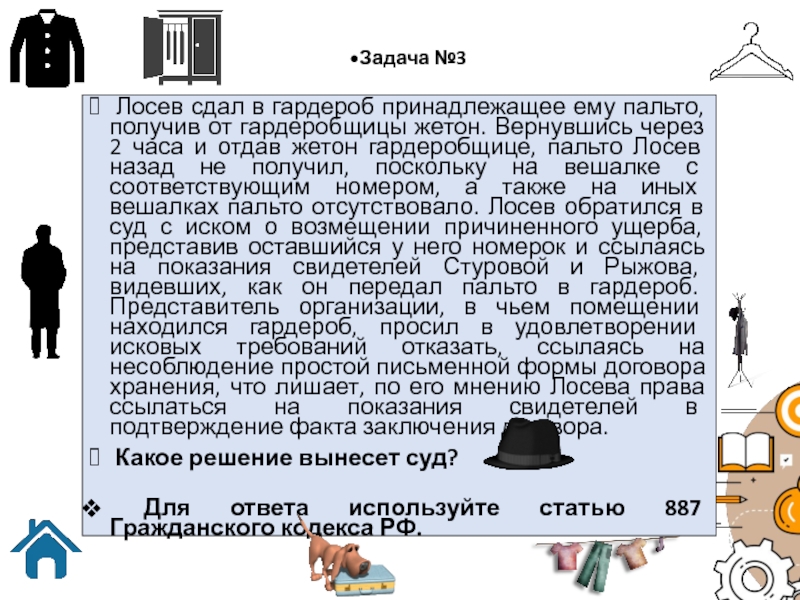 жетон. Вернувшись через 2 часа и отдав жетон гардеробщице, пальто Лосев назад не получил, поскольку на вешалке с соответствующим номером, а также на иных вешалках пальто отсутствовало. Лосев обратился в суд с иском о возмещении причиненного ущерба, представив оставшийся у него номерок и ссылаясь на показания свидетелей Стуровой и Рыжова, видевших, как он передал пальто в гардероб. Представитель организации, в чьем помещении находился гардероб, просил в удовлетворении исковых требований отказать, ссылаясь на несоблюдение простой письменной формы договора хранения, что лишает, по его мнению Лосева права ссылаться на показания свидетелей в подтверждение факта заключения договора.