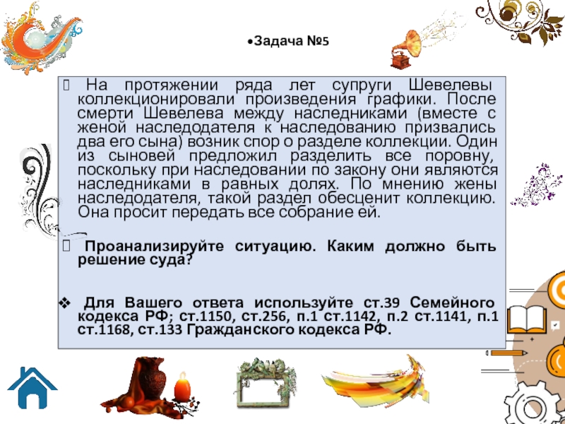 смерти Шевелева между наследниками (вместе с женой наследодателя к наследованию призвались два его сына) возник спор о разделе коллекции. Один из сыновей предложил разделить все поровну, поскольку при наследовании по закону они являются наследниками в равных долях. По мнению жены наследодателя, такой раздел обесценит коллекцию. Она просит передать все собрание ей.