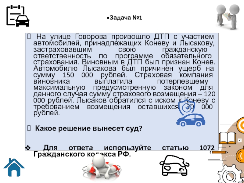 и Лысакову, застраховавшим свою гражданскую ответственность по программе обязательного страхования. Виновным в ДТП был признан Конев. Автомобилю Лысакова был причинен ущерб на сумму 150 000 рублей. Страховая компания виновника выплатила потерпевшему максимальную предусмотренную законом для данного случая сумму страхового возмещения – 120 000 рублей. Лысаков обратился с иском к Коневу с требованием возмещения оставшихся 30 000 рублей.