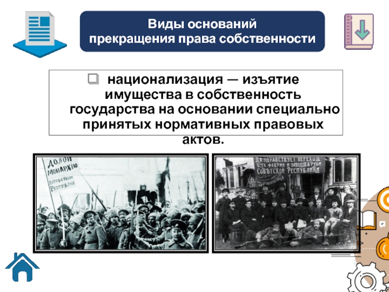 Слайд 16национализация — изъятие имущества в собственность государства на основании специально принятых