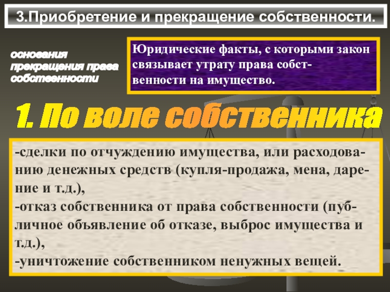 -отказ собственника от права собственности (пуб-личное объявление об отказе, выброс имущества и т.д.),