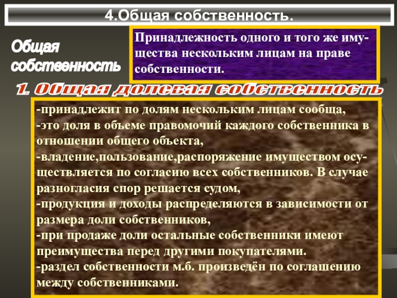-владение,пользование,распоряжение имуществом осу-ществляется по согласию всех собственников. В случае разногласия спор решается судом,