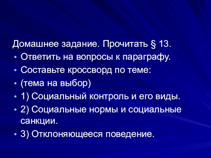 Домашнее задание. Прочитать § 13.Ответить на вопросы к параграфу.Составьте кроссворд по теме:(тема на выбор)1) Социальный контроль и