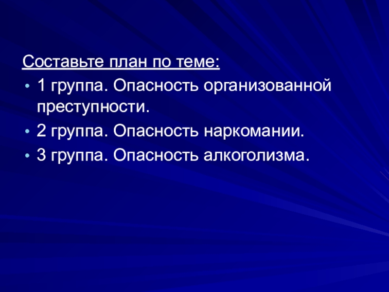 Составьте план по теме:1 группа. Опасность организованной преступности. 2 группа. Опасность наркомании. 3 группа. Опасность алкоголизма.