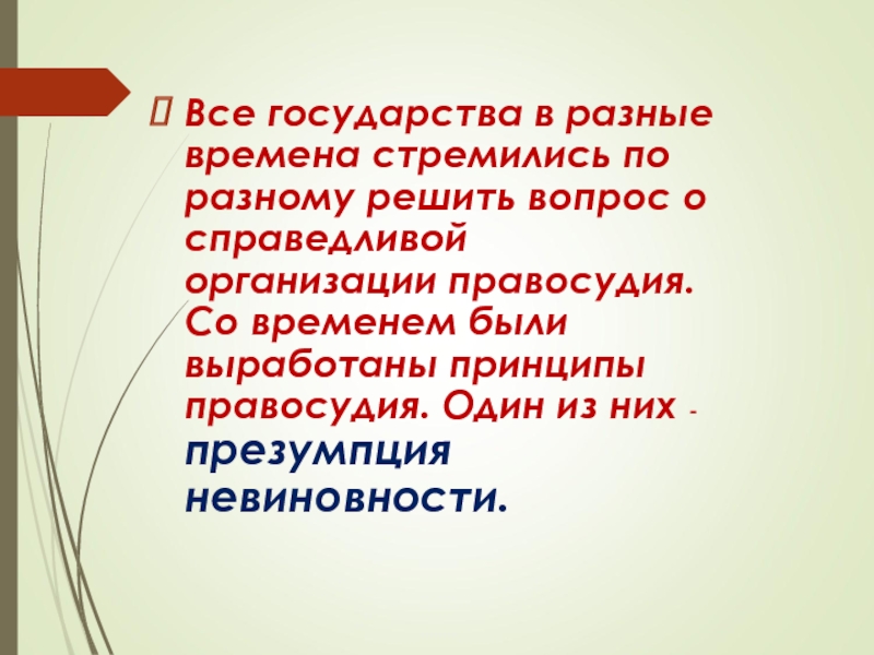 справедливой организации правосудия. Со временем были выработаны принципы правосудия. Один из них - презумпция невиновности.