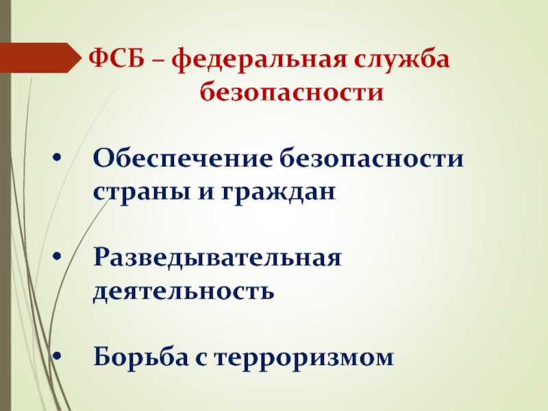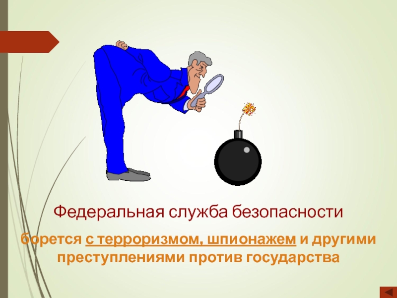 служба безопасности(ФСБ) (шпионаж, террор, наркобизнес, коррупция).