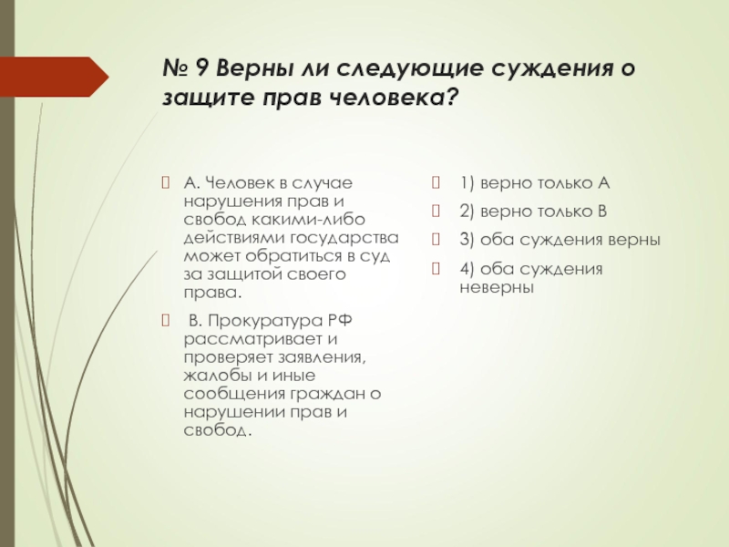 Слайд 54№ 9 Верны ли следующие суждения о защите прав человека?