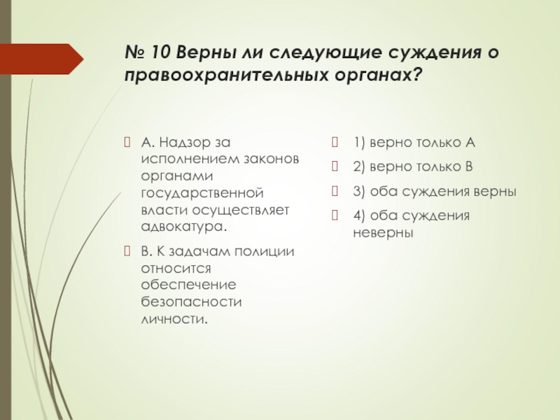 Слайд 55№ 10 Верны ли следующие суждения о правоохранительных органах?