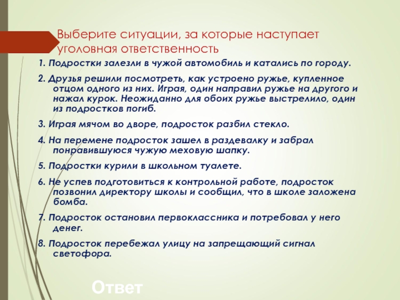 Слайд 12Выберите ситуации, за которые наступает уголовная ответственность