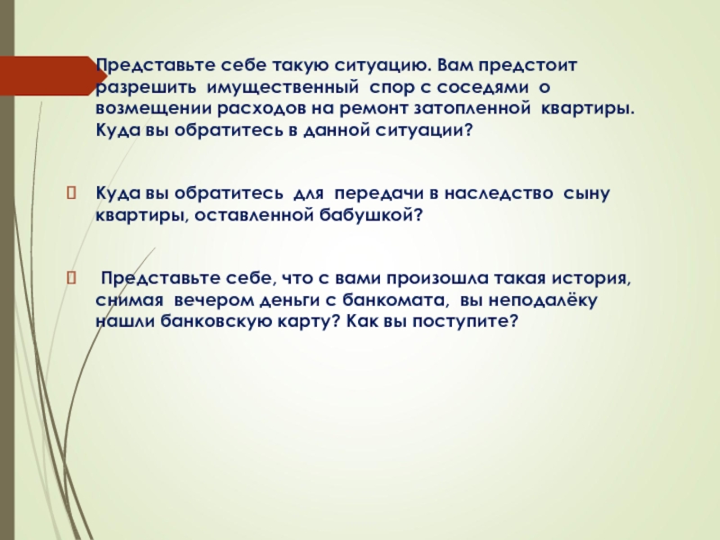 Слайд 15Представьте себе такую ситуацию. Вам предстоит разрешить имущественный спор с соседями
