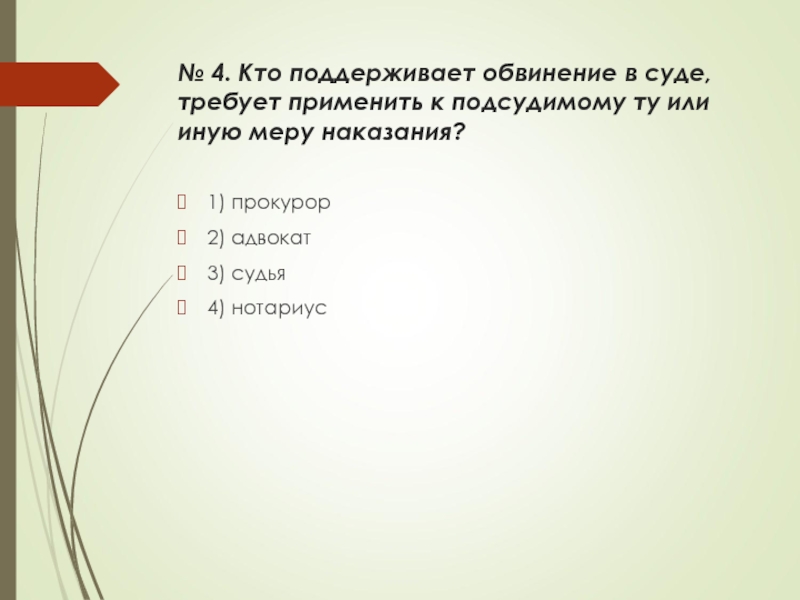 Слайд 49№ 4. Кто поддерживает обвинение в суде, требует применить к подсудимому