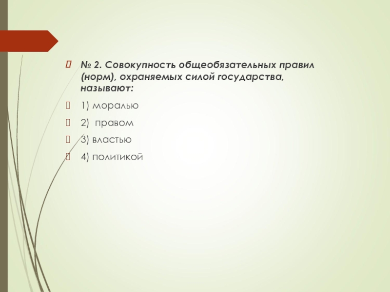 № 2. Совокупность общеобязательных правил (норм), охраняемых силой государства, называют:
