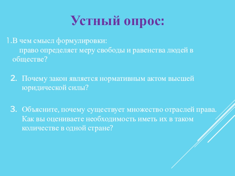 Устный опрос:В чем смысл формулировки: право определяет меру свободы и равенства людей в обществе?Почему закон является нормативным актом высшей юридической силы?Объясните, почему существует множество отраслей права. Как вы оцениваете необходимость иметь их в таком