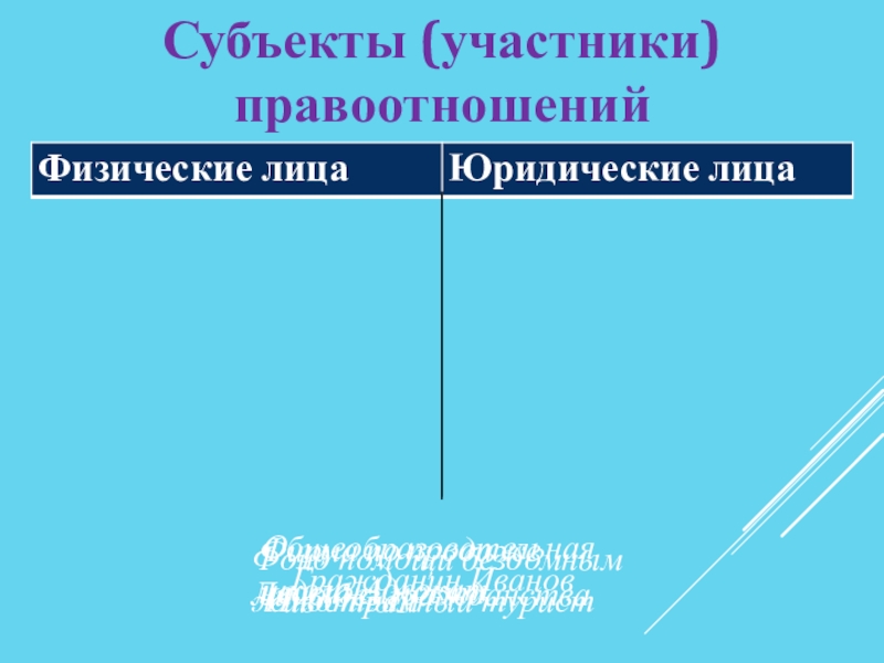 Субъекты (участники) правоотношенийГражданин ИвановИностранный туристЛицо без гражданстваАдвокатФонд помощи бездомным животнымОбщеобразовательная школаФирма по продаже недвижимости
