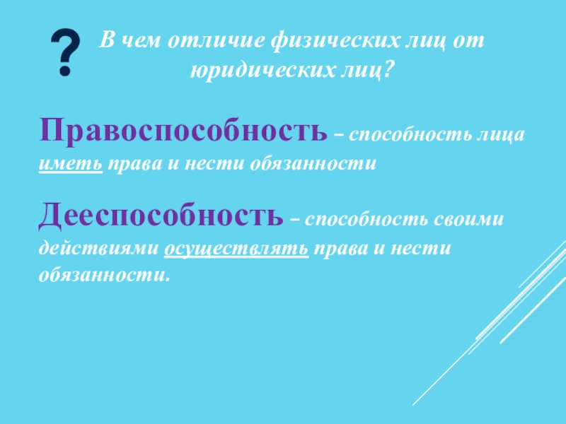 В чем отличие физических лиц от юридических лиц??Правоспособность – способность лица иметь права и нести обязанностиДееспособность –