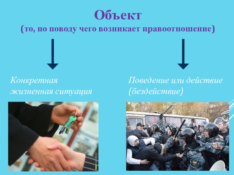 Объект (то, по поводу чего возникает правоотношение)Конкретная жизненная ситуация Поведение или действие (бездействие)