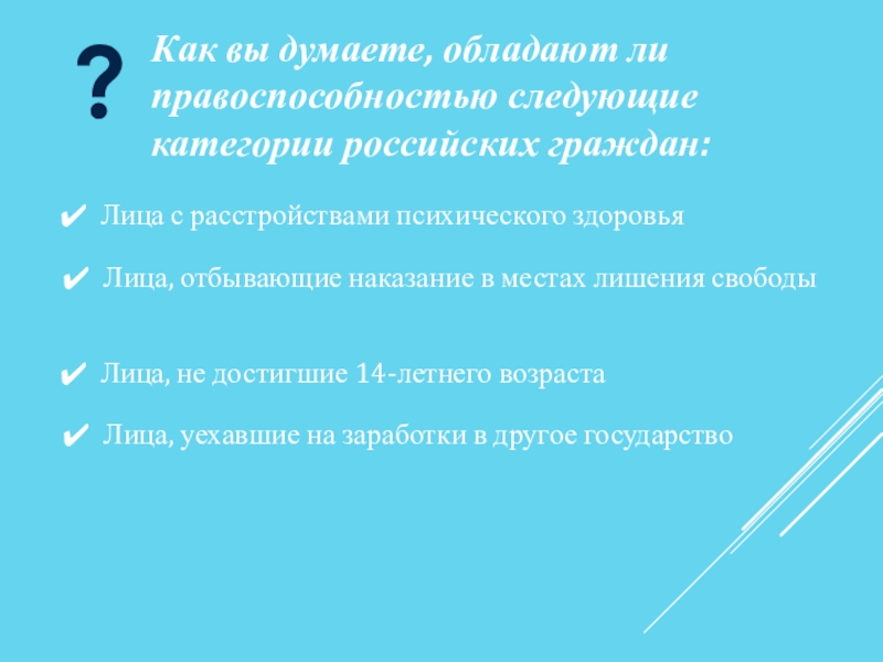 ?Как вы думаете, обладают ли правоспособностью следующие категории российских граждан:Лица, уехавшие на заработки в другое государствоЛица с