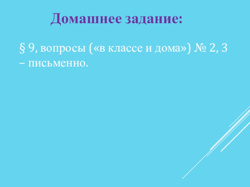 Домашнее задание:§ 9, вопросы («в классе и дома») № 2, 3 – письменно.