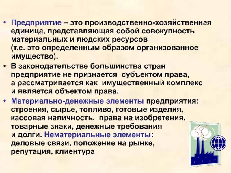 Предприятие – это производственно-хозяйственная единица, представляющая собой совокупность материальных и людских