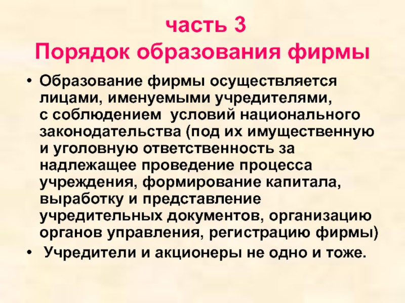 с соблюдением условий национального законодательства (под их имущественную и уголовную ответственность за надлежащее проведение процесса учреждения, формирование капитала, выработку и представление учредительных документов, организацию органов управления, регистрацию фирмы)