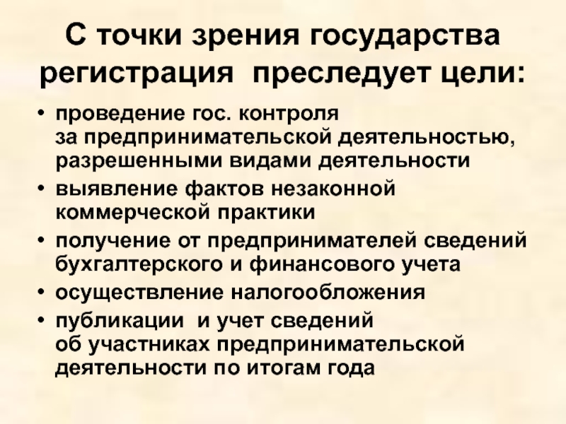 Слайд 18С точки зрения государства регистрация преследует цели: