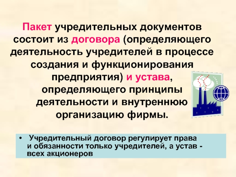 Слайд 14Пакет учредительных документов состоит из договора (определяющего деятельность учредителей в процессе