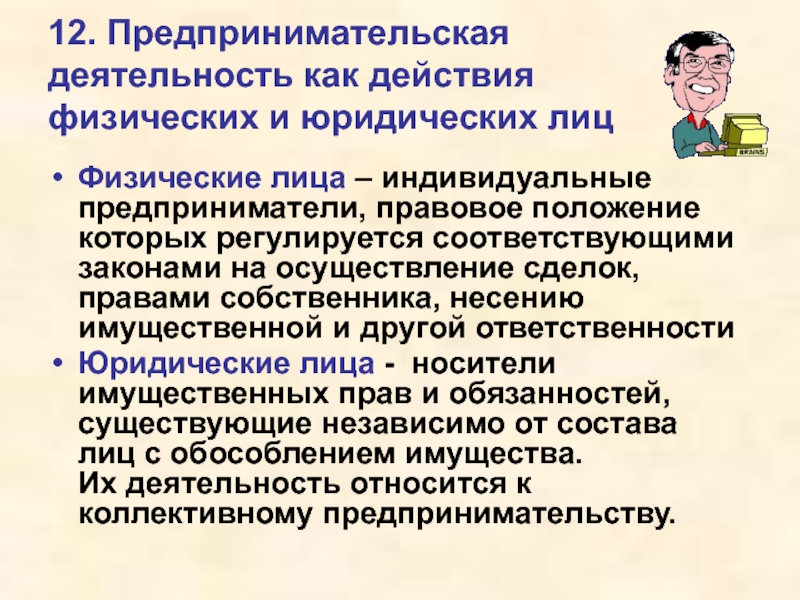 индивидуальные предприниматели, правовое положение которых регулируется соответствующими законами на осуществление сделок, правами собственника, несению имущественной и другой ответственности