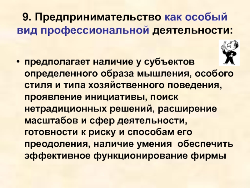 образа мышления, особого стиля и типа хозяйственного поведения, проявление инициативы, поиск нетрадиционных решений, расширение масштабов и сфер деятельности, готовности к риску и способам его преодоления, наличие умения обеспечить эффективное функционирование фирмы