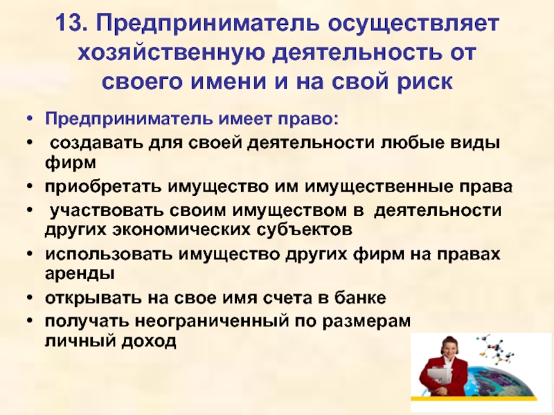 Слайд 613. Предприниматель осуществляет хозяйственную деятельность от своего имени и на свой