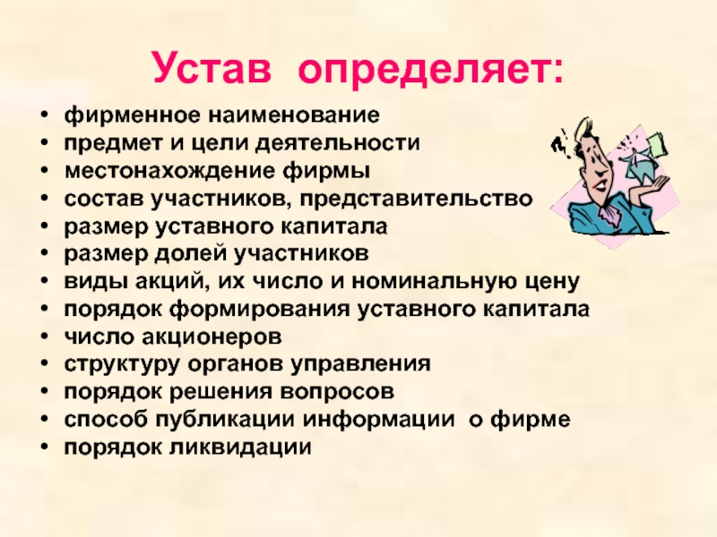создания и функционирования предприятия) и устава, определяющего принципы деятельности и внутреннюю организацию фирмы.