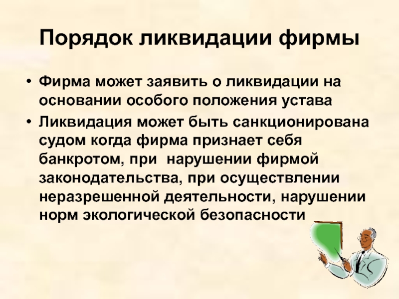 Ликвидация может быть санкционирована судом когда фирма признает себя банкротом, при нарушении фирмой законодательства, при осуществлении неразрешенной деятельности, нарушении норм экологической безопасности
