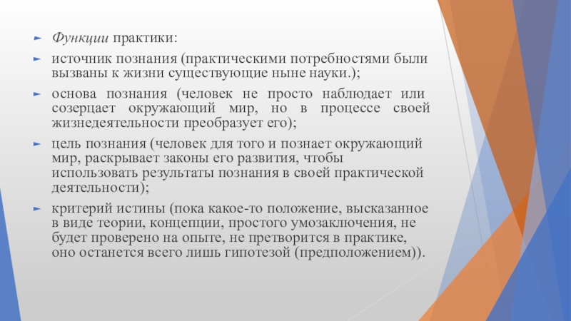 критерий истины (пока какое-то положение, высказанное в виде теории, концепции, простого умозаключения, не будет проверено на опыте, не претворится в практике, оно останется всего лишь гипотезой (предположением)).