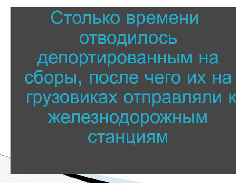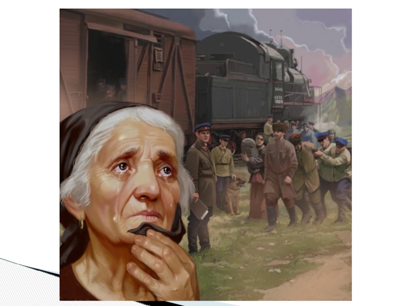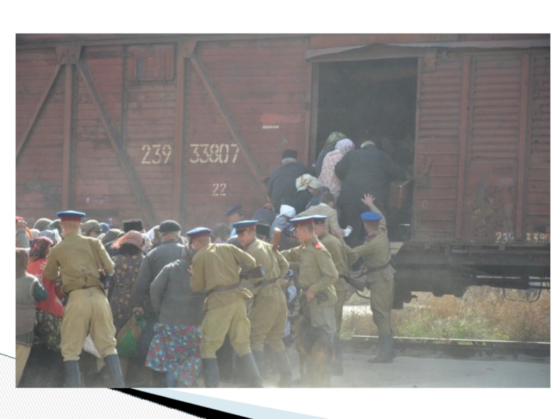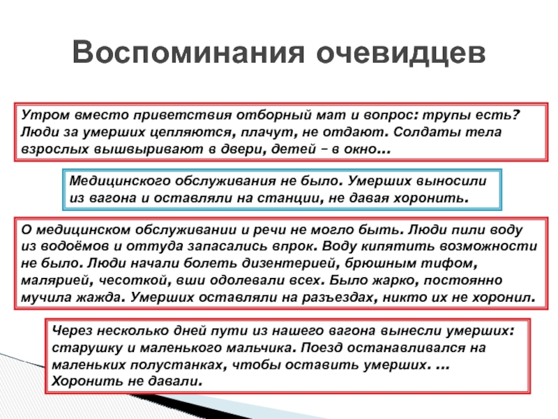 Через несколько дней пути из нашего вагона вынесли умерших: старушку и маленького мальчика. Поезд останавливался на маленьких полустанках, чтобы оставить умерших. ... Хоронить не давали.