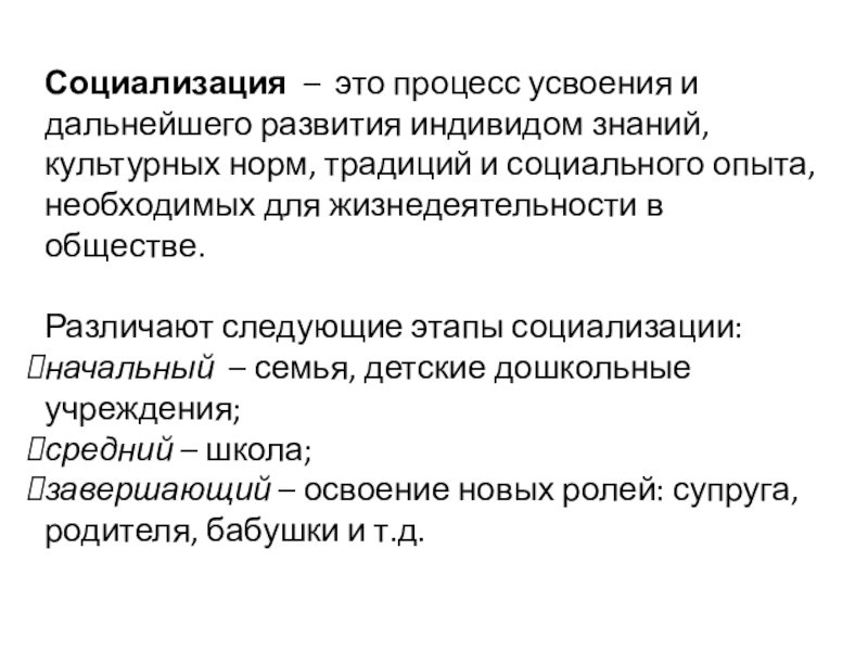 Слайд 7Социализация – это процесс усвоения и дальнейшего развития индивидом знаний, культурных норм,