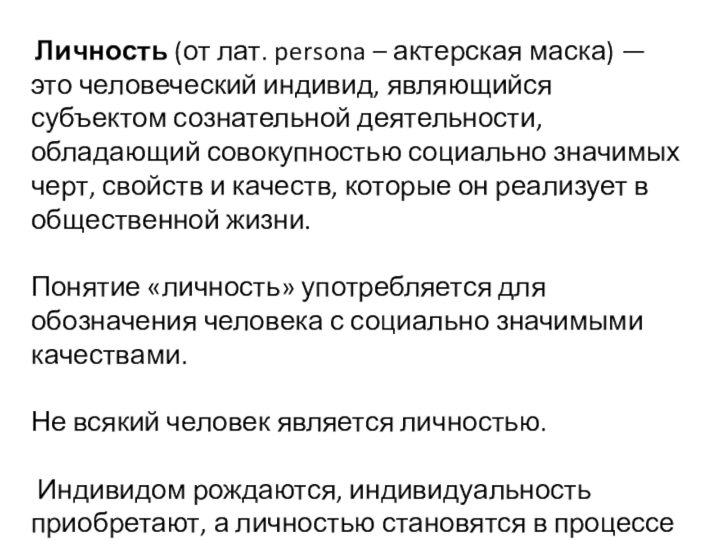 Слайд 6 Личность (от лат. persona – актерская маска) — это человеческий индивид,