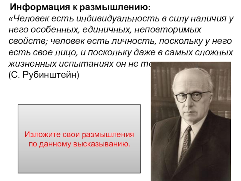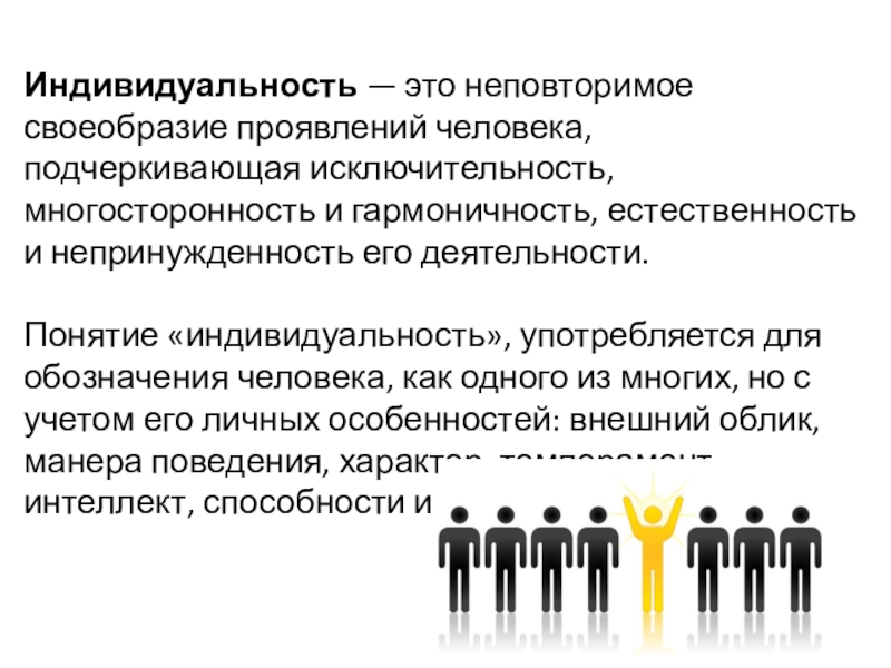 Слайд 5Индивидуальность — это неповторимое своеобразие проявлений человека, подчеркивающая исключительность, многосторонность и гармоничность,