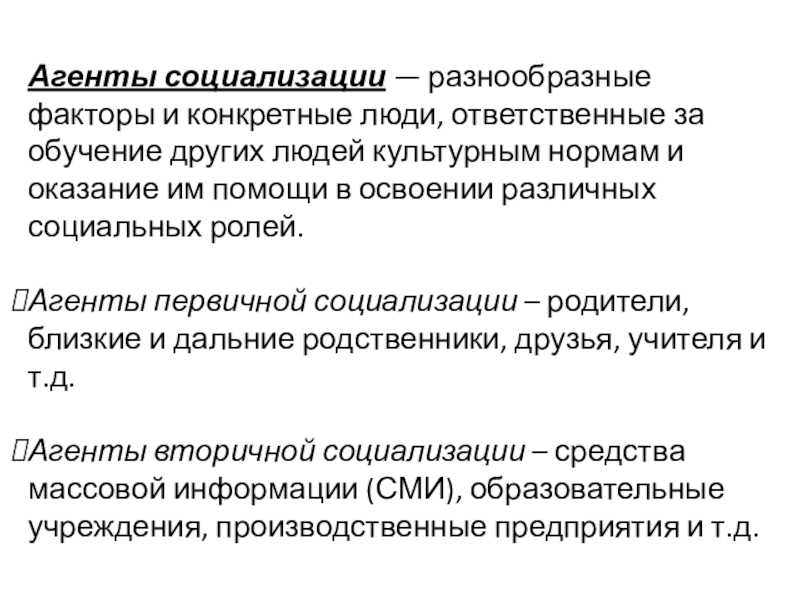 Слайд 8Агенты социализации — разнообразные факторы и конкретные люди, ответственные за обучение других