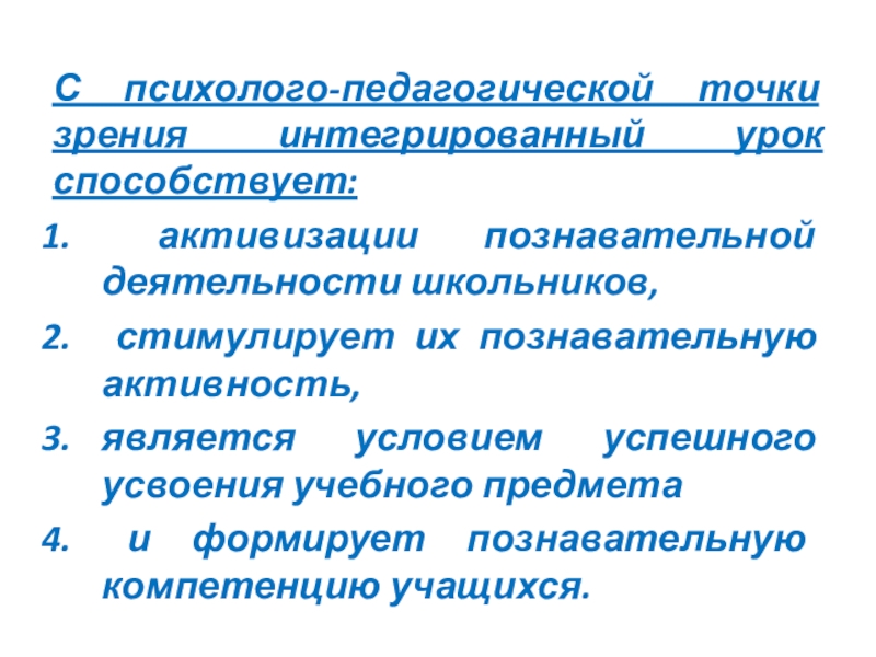 Слайд 41С психолого-педагогической точки зрения интегрированный урок способствует: