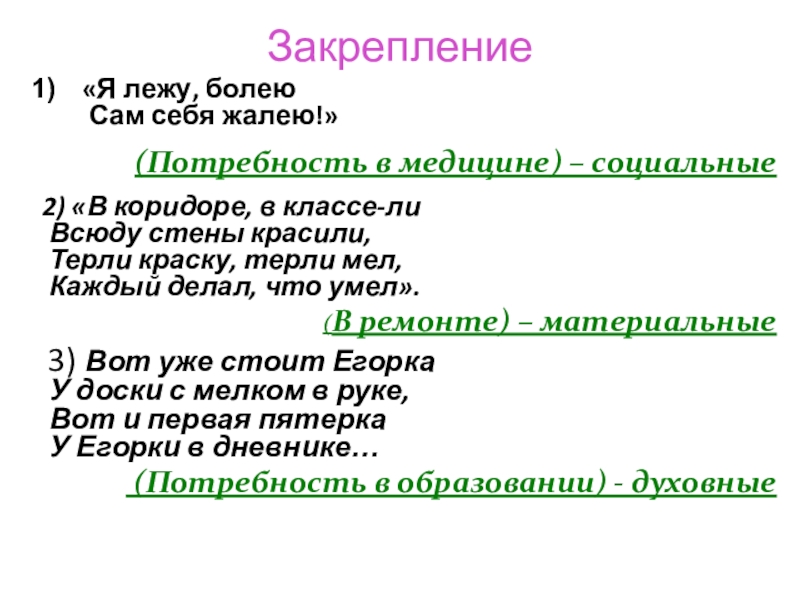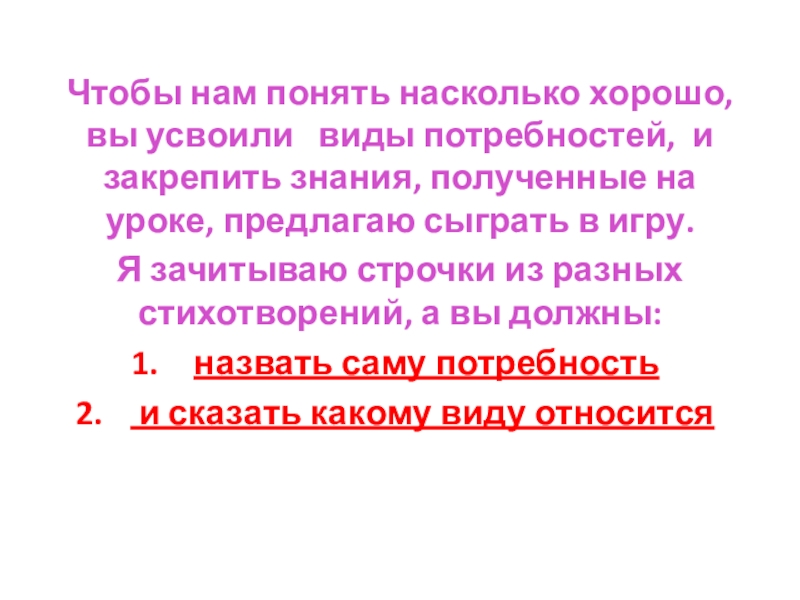 Слайд 34Чтобы нам понять насколько хорошо, вы усвоили виды потребностей, и