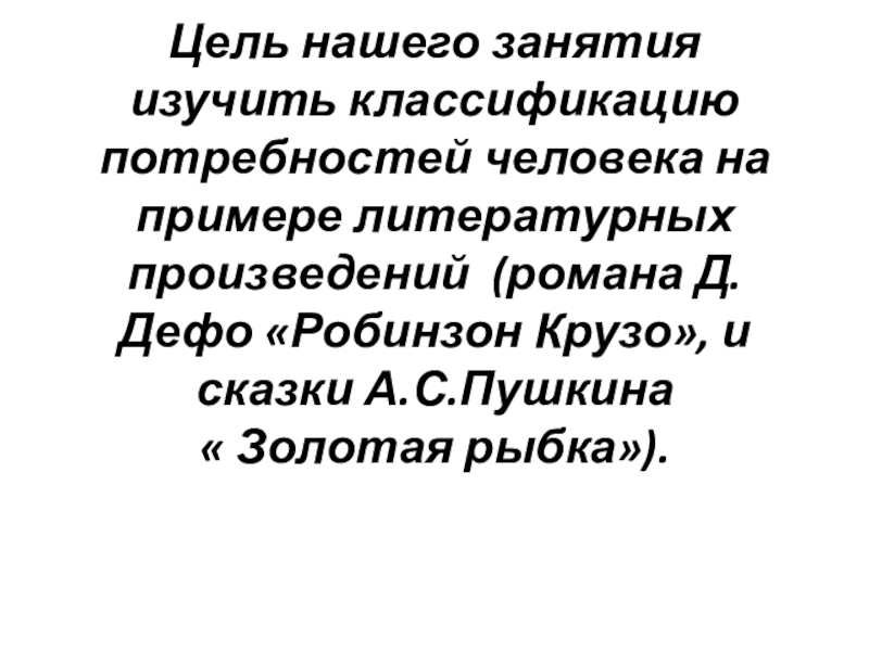 Слайд 13Цель нашего занятия изучить классификацию потребностей человека на примере литературных произведений