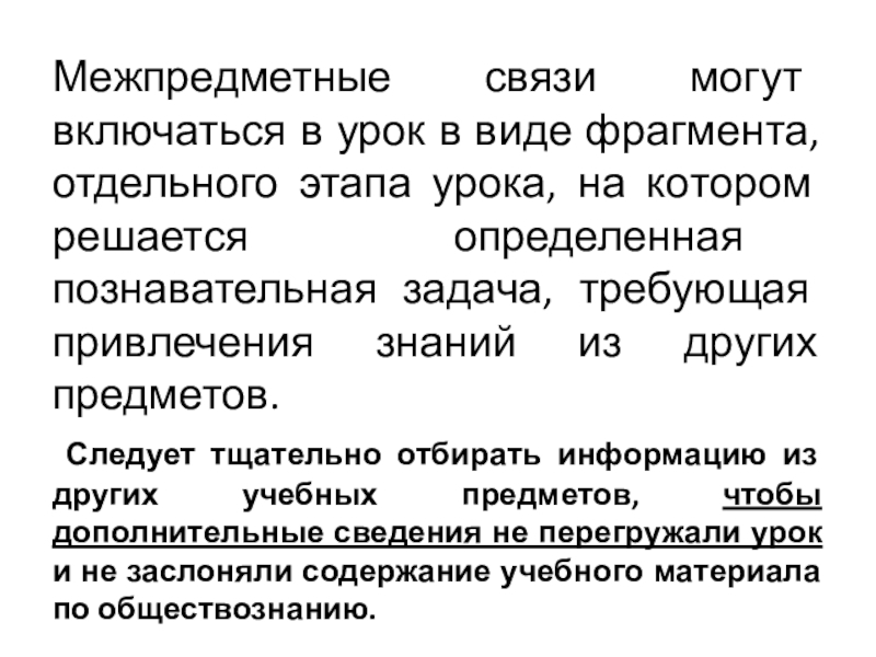 Следует тщательно отбирать информацию из других учебных предметов, чтобы дополнительные сведения не перегружали урок и не заслоняли содержание учебного материала по обществознанию.