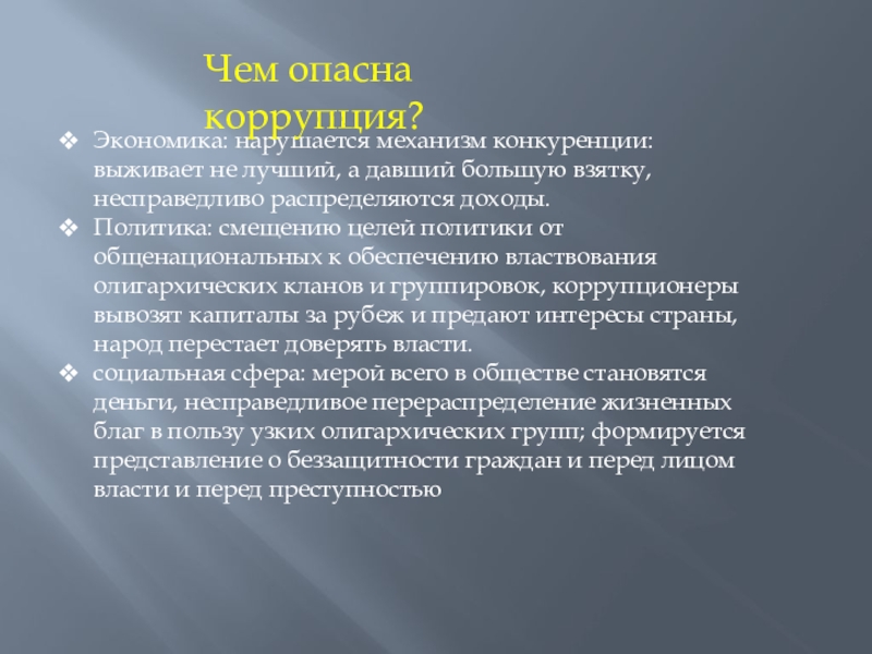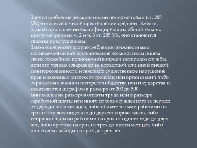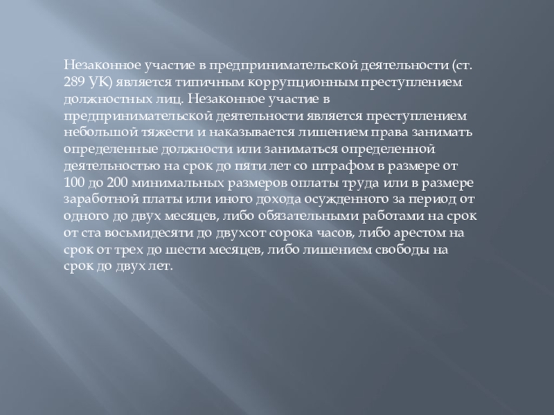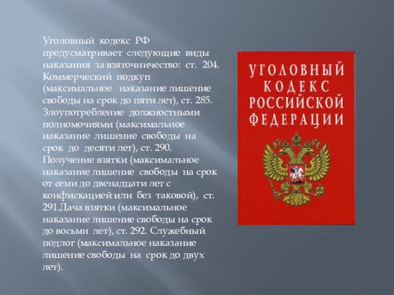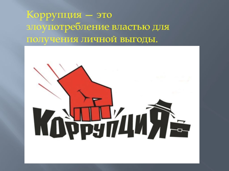 злоупотребление служебным положением, дача взятки, получение взятки, злоупотребление полномочиями, коммерческий подкуп либо иное незаконное использование физическим лицом своего должностного положения вопреки законным интересам общества и государства в целях получения выгоды в виде денег, ценностей, иного имущества или услуг имущественного характера, иных имущественных прав для себя или для третьих лиц либо незаконное предоставление такой выгоды указанному лицу другими физическими лицами;