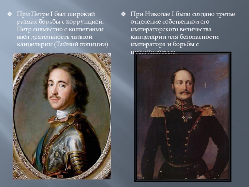При Петре I был широкий размах борьбы с коррупцией. Петр совместно с коллегиями ввёл деятельность тайной канцелярии (Тайной полиции)