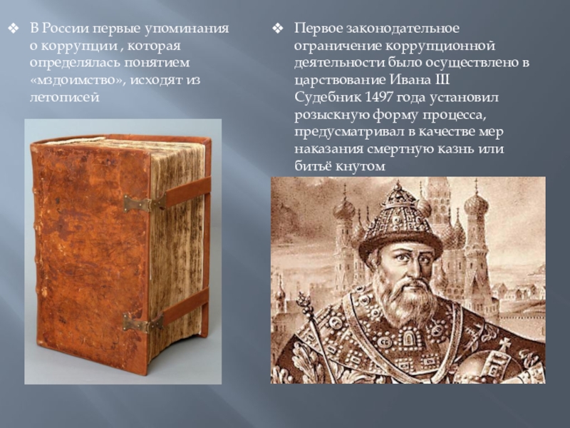 Первое законодательное ограничение коррупционной деятельности было осуществлено в царствование Ивана III