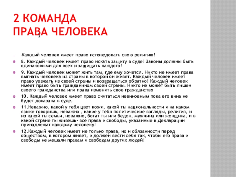 1. Все люди рождаются свободными и равными, все имеют одинаковое достоинство и права. Все наделены разумом и должны относиться друг к другу как братья и сестры.