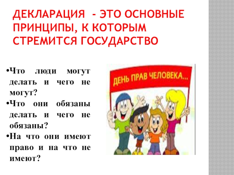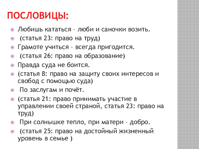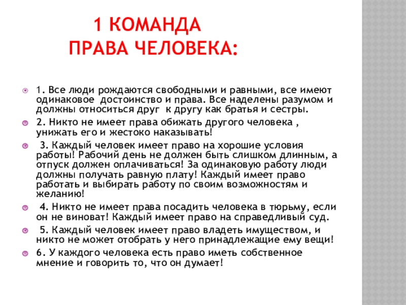 3. Каждый человек имеет право на хорошие условия работы! Рабочий день не должен быть слишком длинным, а отпуск должен оплачиваться! За одинаковую работу люди должны получать равную плату! Каждый имеет право работать и выбирать работу по своим возможностям и желанию!
